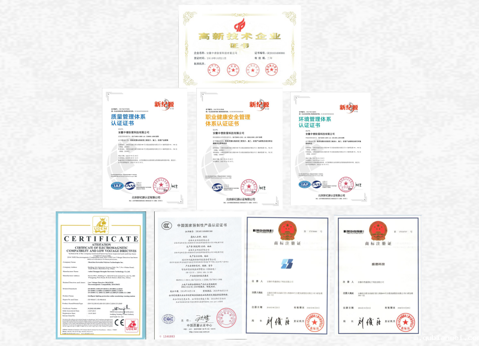 公司使用的产品均通过了北京雷电防护装置测试中心等国家权威性检测机构检测,具有CE、CCC等相关认证,以过硬的工程质量获得了中国人保的工程质量承保。